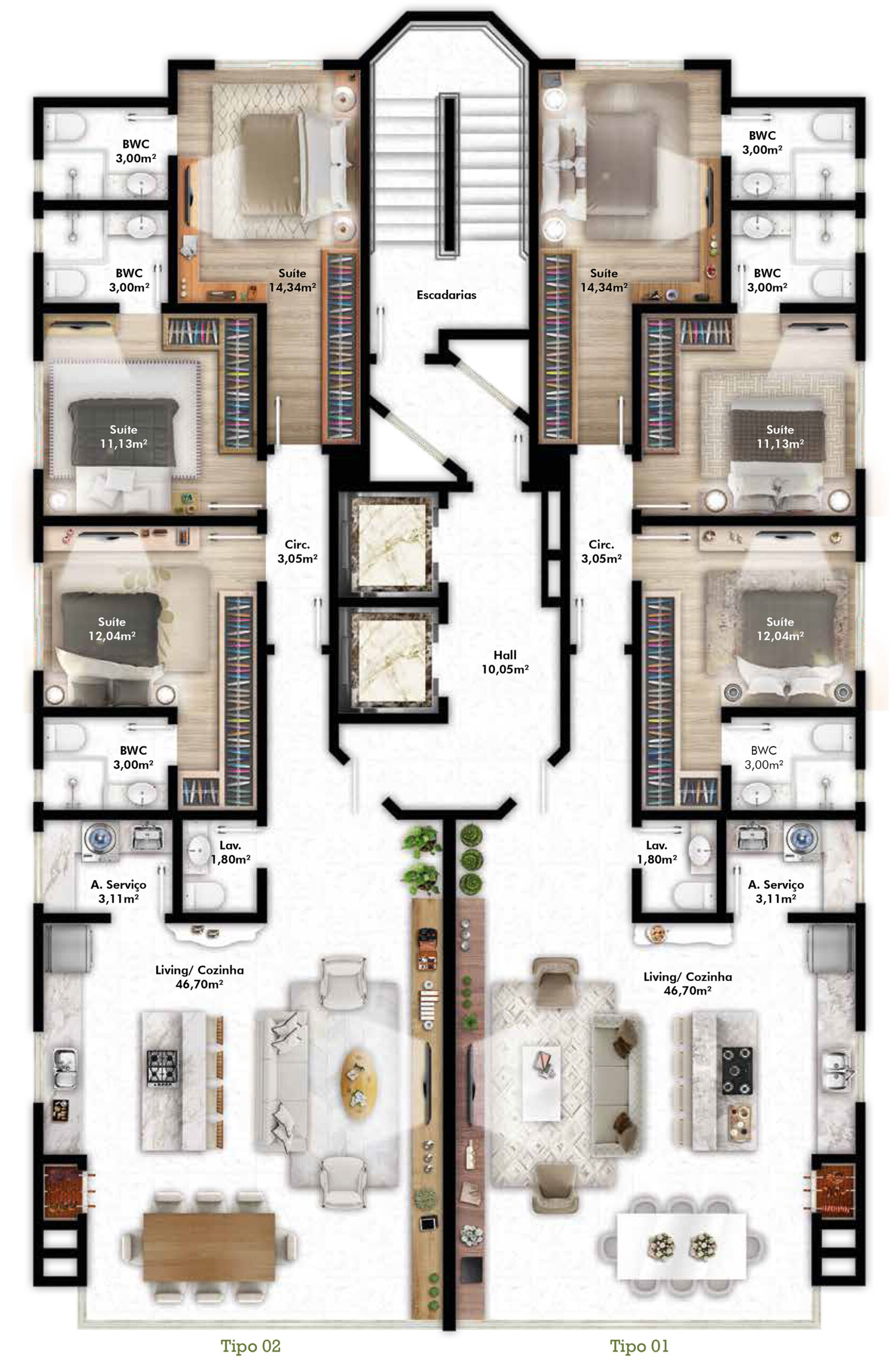 - 02 apartamentos por andar (tipos e diferenciados)